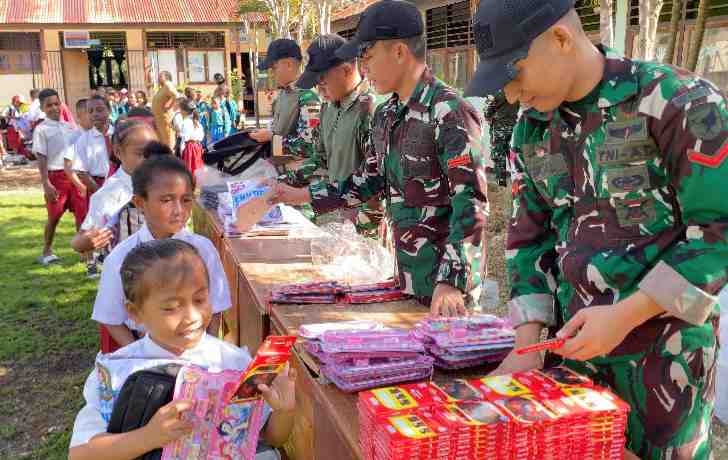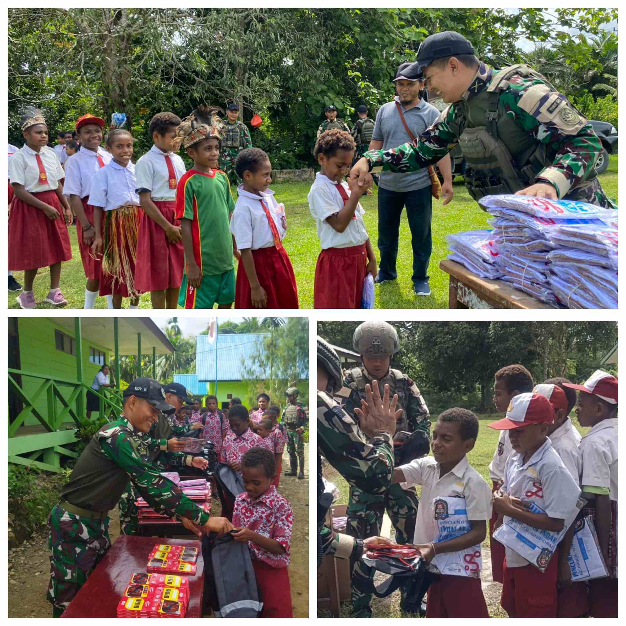 Dberita.ID | Keerom — Personil Satgas Yonif 643/Wns Pos Kotis, Pos Wembi, Pos Waris dan Pos Kaliasin melaksanakan kegiatan pembagian seragam sekolah, tas, alat tulis kantor (ATK) dan pensil warna kepada siswa-siswi Sekolah Dasar (SD) di wilayah binaan sebagai bentuk kepedulian terhadap dunia pendidikan di Kabupaten Keerom, Provinsi Papua, Rabu (28/1/2026).