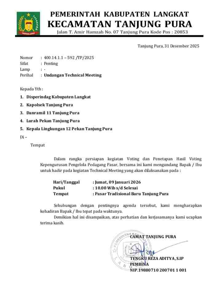 Technical meeting itu dijadwalkan berlangsung pada Jumat, 9 Januari 2026, dan ditandatangani langsung oleh Camat Tanjung Pura, Tengku Reza Aditya, S.IP.